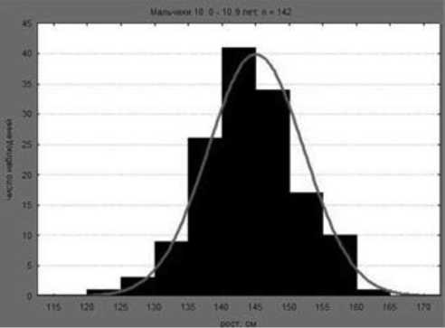 Из курса общей биологии средней школы все помнят, что любой показатель в работе организма, который можно измерить, в достаточно большой выборке людей одного возраста будет не одним и тем же, а немного различающимся. Если построить гистограмму распределения точных значений этого показателя, его огибающая будет иметь форму нормального распределения. Например, как показано на слайде, мальчики одного возраста имеют рост от 125 до 165 см. Это значит, что если организм имеет генетическую предрасположенность к высокому росту, то при достаточном питании мальчик вырастет до 165 см. Если его недокармливать, он, скорее всего, не остановится на 125 см, а вырастет до 150–155 см. Наоборот, если у ребенка генетическая предрасположенность к низкорослости, то при избыточном белковом питании и адекватной физической нагрузке он может вытянуться до 150 см, но роста 165 см, скорее всего, не достигнет.