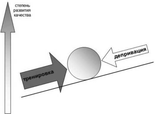 Проиллюстрируем эту мысль на примере шарика на наклонной плоскости. Чтобы развить какое-либо качество организма, нужно серьезно потрудиться. Причем это не только двигательные качества, такие, как сила, скорость, выносливость, гибкость, ловкость. Это качества любого вида – способность различать оттенки цветов, слышать и понимать музыку или иностранную речь, различать запахи. Но эти качества у бездеятельного организма, в условиях депривации, т. е. лишения, не просто не развиваются, но деградируют. Если мышцы неподвижны, например, под гипсовой повязкой, в них идут процессы дистрофии. Если мозгом не пользоваться, тупеешь. Как написано у Льюиса Кэрролла, для того, чтобы стоять на месте, нужно бежать изо всех сил. А для того, чтобы двигаться вперед, нужно бежать вдвое быстрее.