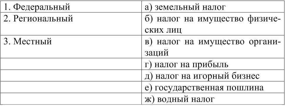 2.5 Сгруппируйте нижеперечисленные налоги, разделив их на прямые и косвенные, федеральные, региональные и местные: налог на добавленную стоимость, налог на игорный бизнес, налог на имущество физических лиц, налог на прибыль организаций, земельный налог, водный налог, налог на доходы физических лиц, налог на имущество организаций, налог на добычу полезных ископаемых, акцизы.