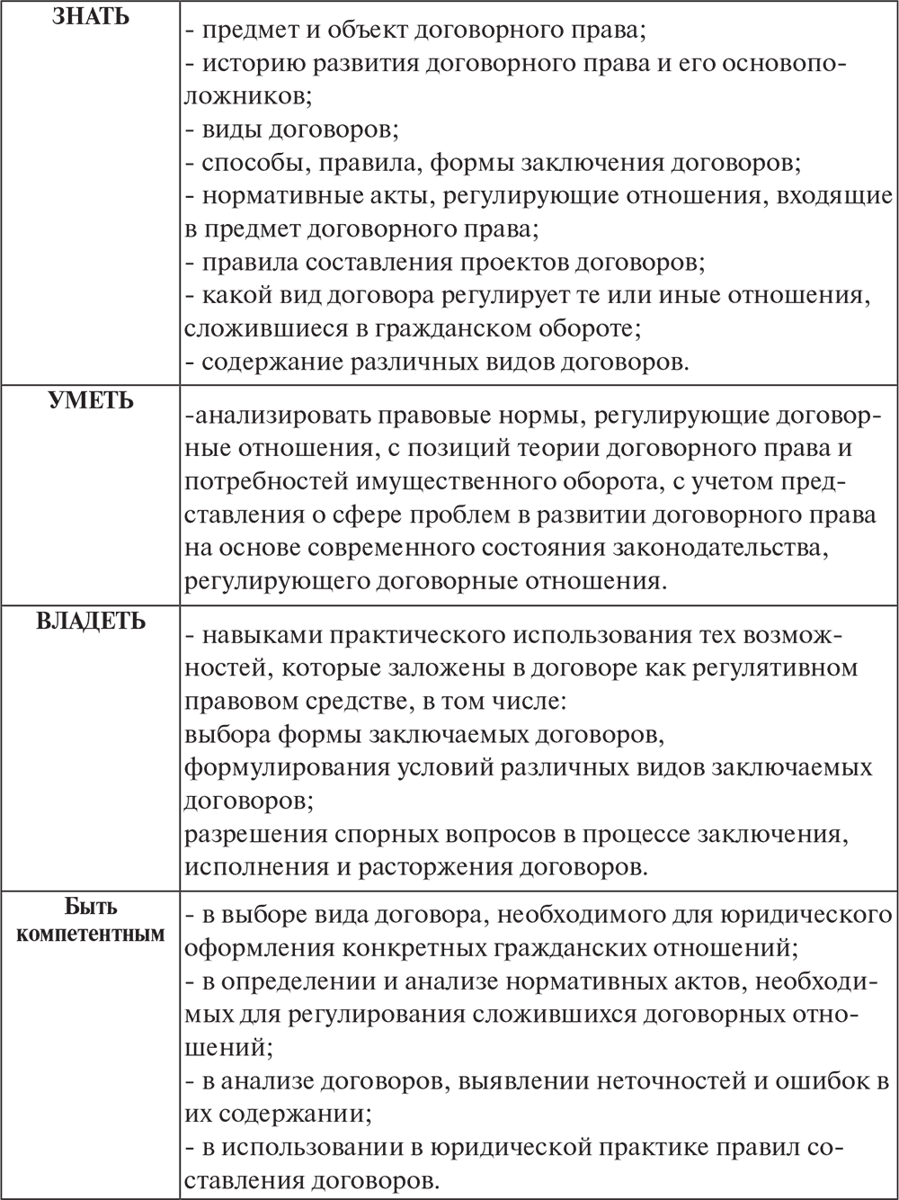 Целями учебной дисциплины «Договорное право» являются достижение всестороннего и глубокого понимания студентами природы и сущности договорных отношений, расширение объема представлений и знаний о конкретных договорах, их особенностей с учетом реальных, правовых ситуаций.