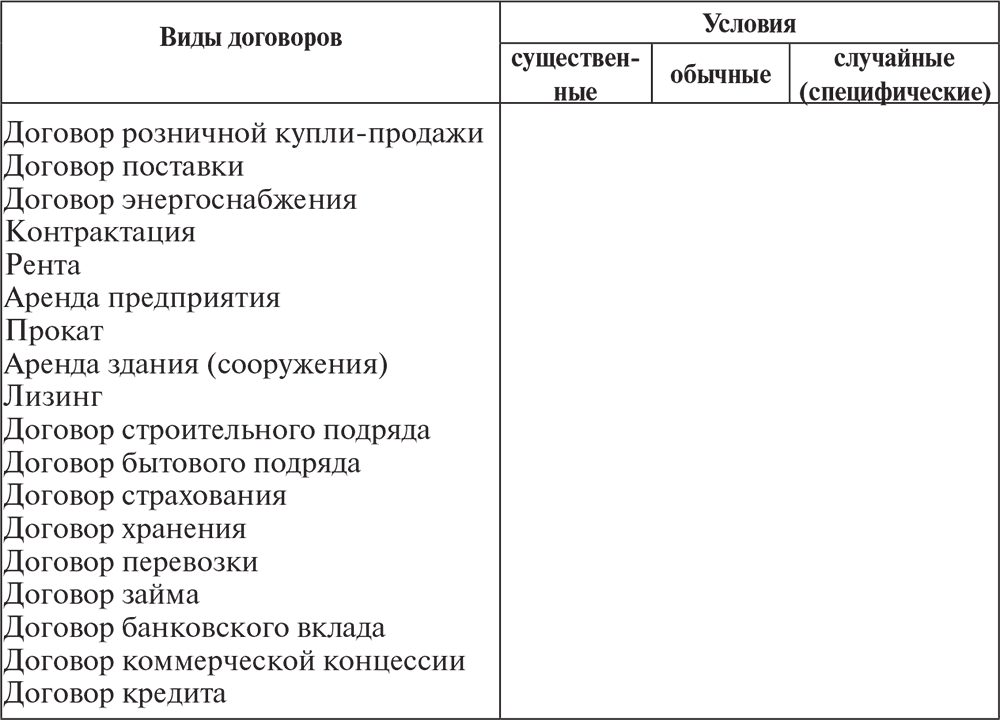 1. Заполните таблицу, определив в ней существенные, обычные и случайные (специфические) условия для различных видов договоров