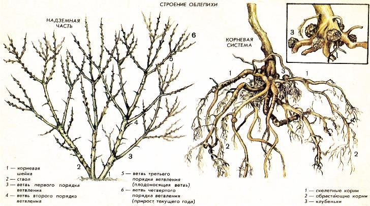Характерная особенность облепихи – наличие корневых клубеньков, играющих важную роль в жизни растения. У взрослых кустов они достигают достаточно больших размеров – почти с куриное яйцо, а иногда и крупнее, наряду с более мелкими образованиями. Благодаря корневым клубенькам облепиха усваивает азот из воздуха подобно бобовым культурам, поэтому обрезать их не следует. Ростовые побеги облепихи бывают разных типов. Из почек, расположенных на прошлогодних приростах, возникают годичные побеги длиной 30…40 см. Они являются побегами продолжения, так как обеспечивают нарастание кроны.