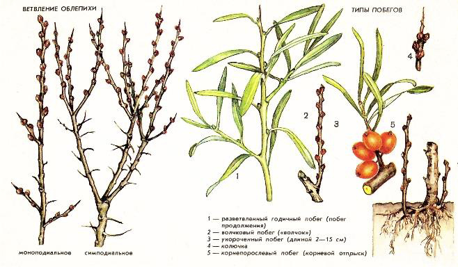 В процессе роста годичные побеги за счет прорастания скороспелых почек часто ветвятся. Возникающие из этих почек боковые побеги называются преждевременными (летними). Из почек, сформировавшихся на прошлогодних приростах, образуются укороченные годичные обрастающие побеги (побеги обогащения). У основания каждого из них у женских особей размещаются плоды. На годичных побегах облепихи образуются также колючки – видоизмененные укороченные летние побеги. В год образования колючки несут на себе листья. Волчковые побеги («волчки») вырастают из спящих почек на многолетних ветвях или стволе при нарушении корреляции между корневой системой и надземной частью при обрезке, наклоне ветвей, а также отмирании надземной части. У облепихи различают два типа ветвления. У молодых (одно-, четырехлетних) растений наблюдается моноподиальное ветвление побегов. При этом сохраняется главная ось (лидер), а боковые побеги развиты значительно слабее и подчинены лидеру. К концу вегетации рост побегов заканчивается верхушечной почкой. При вступлении в плодоношение (через 3–4 года после посадки) наблюдается симподиальное ветвление. Рост побегов заканчивается колючкой, а последующий осуществляется из пяти-семи боковых почек, расположенных близко к отмирающей верхушке.
