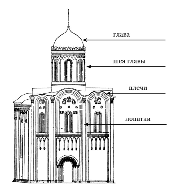 Даже и неискушенный взгляд уловит во внешнем облике, в пропорциях владимирских церквей сходство с человеческой фигурой. Знакомство с древней терминологией, принятой для обозначения деталей русского храма, подтверждает это наблюдение. Элементы здания в сознании человека древней Руси весьма точно соответствовали частям человеческого тела (см. рис. 2).