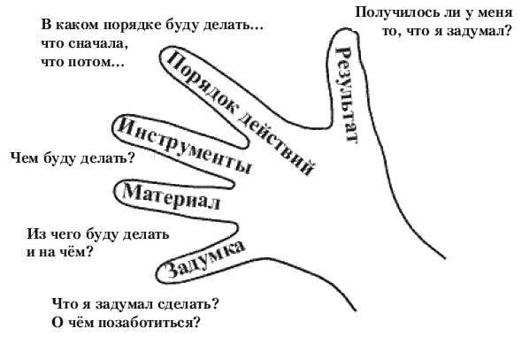 Чтобы помочь ребятишкам научиться управлять своим развитием через выполнение деятельности, я предлагаю использовать модель деятельности в виде пальцев на руке: разгибаете свой мизинчик и спрашиваете у малыша: «Что мы хотим с тобой сделать?», потом разгибаете безымянный палец: «Из чего будем делать?» и т. д.