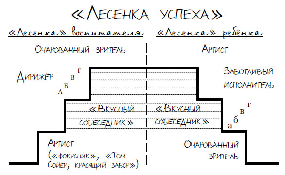Метафорой «Лесенка успеха» я обозначаю любой вид деятельности, которую будет осваивать при содействии воспитателя дошкольник, с одной стороны, и сам воспитатель, осваивающий искусство актёра при исполнении роли на каждой из её ступенек.