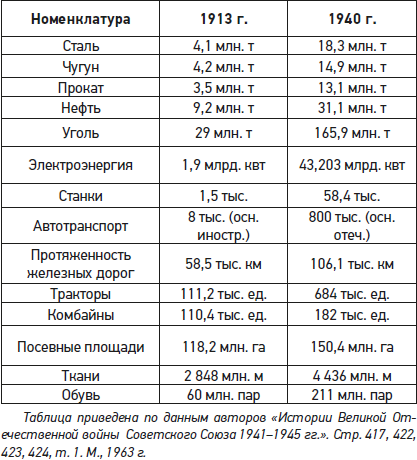 Созданная за годы первой, второй и три года третьей пятилетки материально-техническая база СССР обеспечила прирост валовой продукции более, чем в 2 раза, по сравнению с 1932 г. и в 6 раз – по сравнению с 1913 г. Одни только Магнитогорский, Кузнецкий и Макеевский металлургические заводы, построенные за годы пятилеток, давали чугуна столько же, сколько все заводы России в 1913 г. Продукция машиностроения и металлообработки превысила дореволюционный уровень в 20 раз.