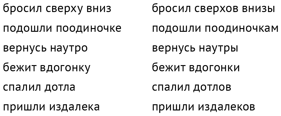 × слитные слова типа «назло, напрямую» (ошибки в сторону пробелов – «на зло, на прямую»);
