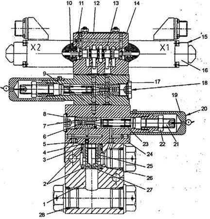 1 – корпус; 2–5 – уплотнительные кольца; 6 – клапан; 7 – втулка; 8 – пробка; 9, 11, 28 – уплотнитель–ные кольца; 10 – пружина; 12 – упор; 13 – золотник; 14 – корпус; 15 – гидрораспределитель; 16 – электромагнит; 17 – прокладка, 18, 20 – управляющие предохранительные клапаны; 19 – колпак; 21 – винт; 22 – гайка; 23 – пружина; 24 – корпус; 25 – клапан; 26 – гильза; 27 – дроссель