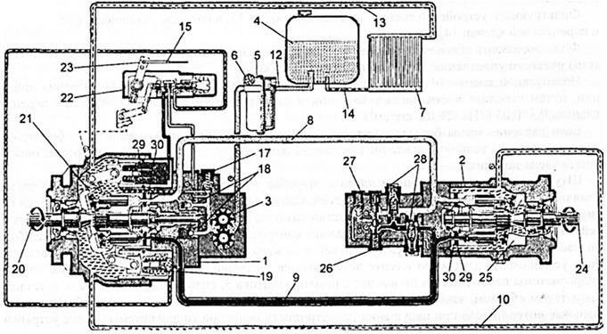 1 – гидронасос основной; 2 – гидромотор; 3 – насос подпитки; 4 – гидробак, 5 – фильтр тонкой очистки, 6 –вакуумметр; 7 – радиатор масляный; 8. 14 –1 гидролинии, 15 – трос управления, 17 – клапан предохранительный насоса подлюки; 18 – клапан обратныый, 19 – сервоцилиндр; 20 – вал насоса; 21 – люлька; 22 –гидрораспределитель; 23 – рычаг управления; 24 – вал гидромотора; 25 – шайба наклонная; 26 – золотник клапанной коробки, 27 – клапан переливной; 28 – клапаны высокого давления; 29 – дно приставное; 30 – распределитель