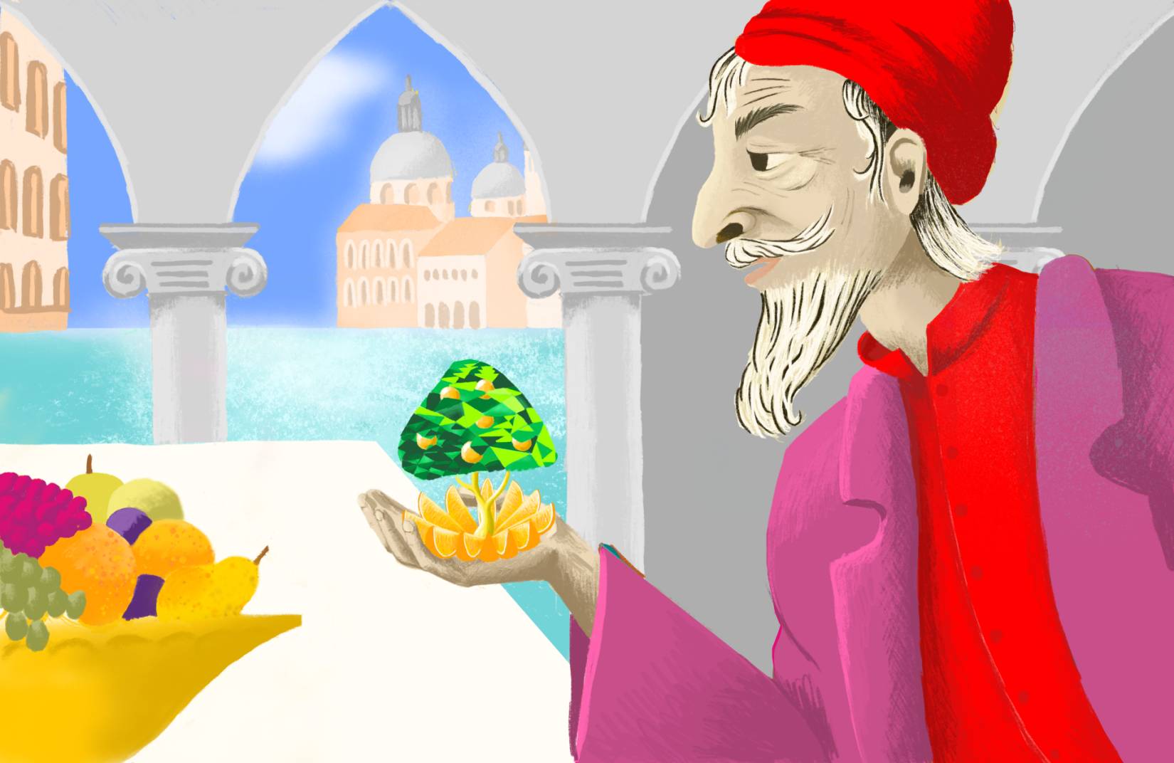 Почтенный венецианский купец синьор Панталоне только что отобедал в своем доме с видом на Гранд-канал. Слуга поставил на стол вазу с фруктами. Старик взял апельсин тонкими бледными пальцами. Послышалась мелодия, как будто внутри фрукта сидел маленький шарманщик. Апельсин раскрылся. Среди двенадцати янтарных долек проросло маленькое деревце. На его золотых ветвях сверкали искрами изумрудные листья. В кроне появились маленькие жемчужинки флердоранжа, которые немедленно сменились яркими плодами из желтого топаза. Плоды и листья тут же облетели, золотые ветви стали тусклыми, словно закоптились, деревце почернело и рассыпалось в прах. Музыка стихла, апельсин закрылся. Синьор Панталоне держал на ладони изящный механизм, столь искусно покрытый оранжевой эмалью, что никто не отличил бы его от обычного апельсина.