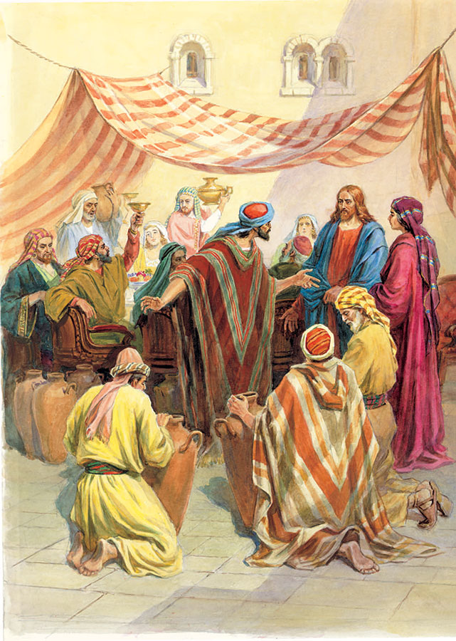 А вскоре в городе Кана в Галилее был брачный пир, на который пригласили Иисуса и мать Его Марию. Приглашены были и ученики Иисуса. И когда кончилось вино, Мария сказала об этом Иисусу. Иисус же ответил, что не пришло еще Его время. Но Мария сказала служителям: «Делайте то, что скажет вам Иисус».