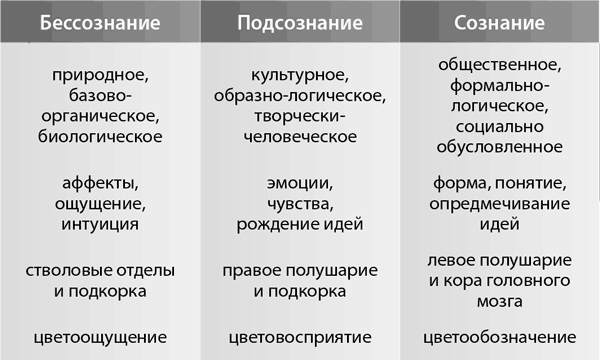 В хроматизме обобщение по цвету было принято соотносить с понятием цветового кодирования. Представим три основных цветовых кода, каждый из которых связан с определенным компонентом интеллекта, влияющим на информационное наполнение архетипов, которые, по Юнгу, выражаются во всеобщих, априорных психических и поведенческих программах коллективного бессознательного.