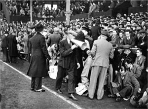 Уполномоченные люди просят футбольных болельщиков не приближаться к кромке поля.