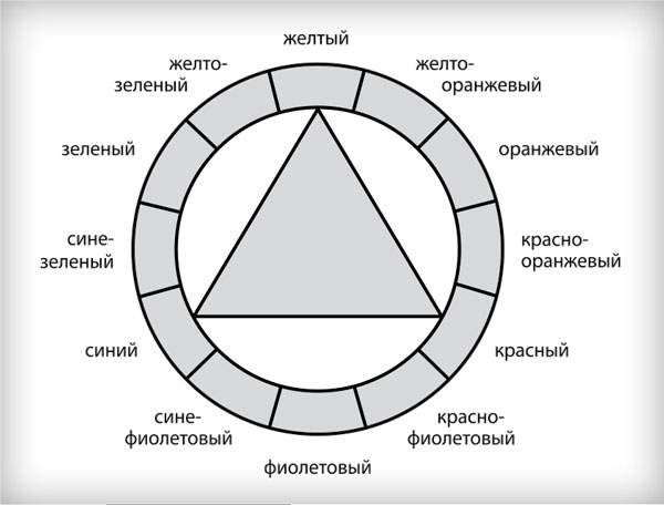 Основное гармоничное созвучие – желтый, красный, синий. Любой равносторонний треугольник, соединяющий цвета в круге Иттена, позволяет выбрать гармоничное сочетание.