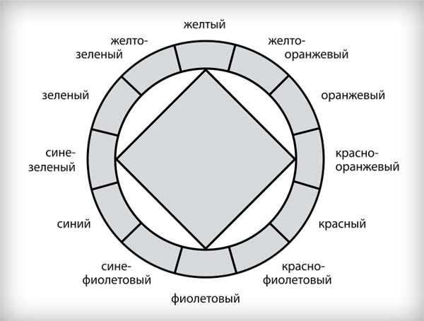 Четыре цвета гармоничны, если они соединяются квадратом (например, желтый, красно-оранжевый, фиолетовый, сине-зеленый).