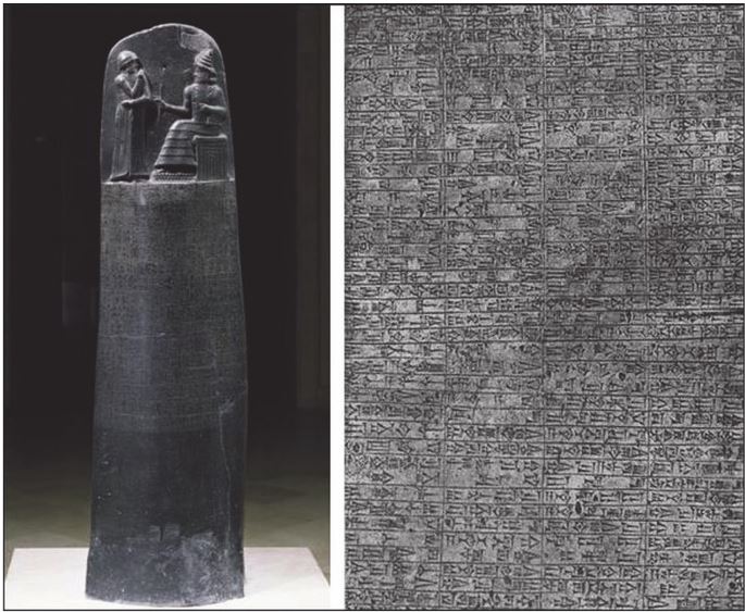 Рис. 2.4. Стела с высеченными клинописью законами Хаммурапи. Клинописный текст занимает обе стороны монумента. На барельефе изображен царь Хаммурапи, стоящий перед богом Шамашем. Бог передает ему свиток с законами. Париж. Лувр