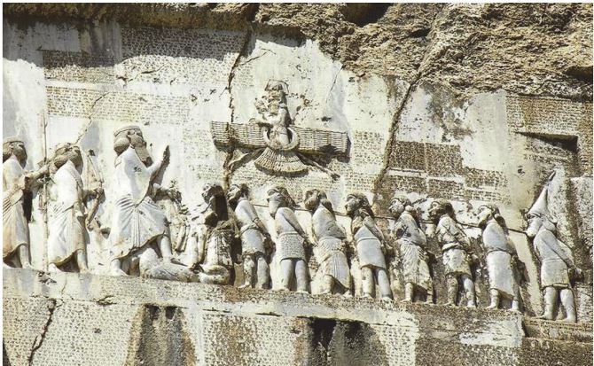 Рис. 2.7. Бехистунская надпись, расшифрованная Г. Роулинсоном в 1840-х гг. Над текстами высечен рельеф: бог Ахура-Мазда вручает Дарию царскую власть