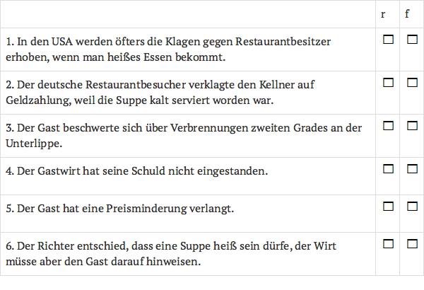 In den USA werden Fastfoodrestaurants bekanntlich gelegentlich auf Schadenersatz in Millionenhöhe verklagt, wenn sie heißen Kaffee servieren, ohne darauf hinzuweisen, dass er heiß ist. Die amerikanische Rechtsprechung hat offenkundig geringes Vertrauen in den Verstand der US-Verbraucher, denn immer wieder sind derartige Klagen erfolgreich. Ein deutscher Restaurantbesucher dachte vielleicht, in Deutschland laufe es genauso, und verklagte einen Wirt auf Zahlung von Schmerzensgeld.