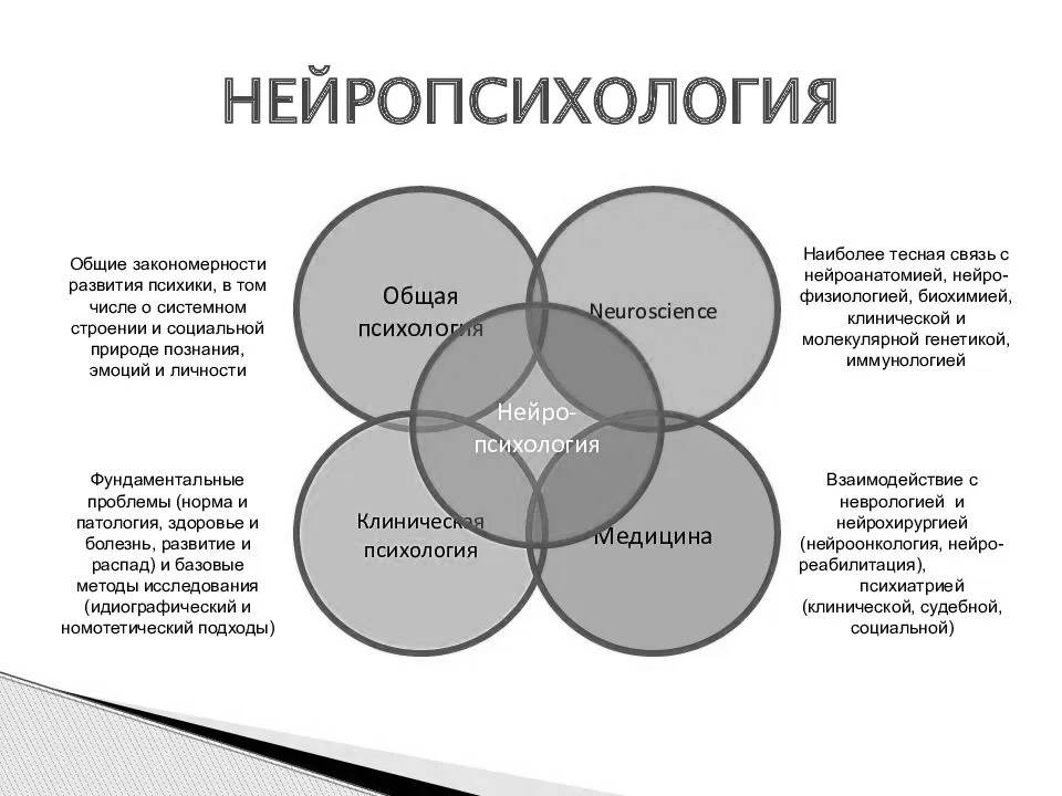 Предмет нейропсихологии – взаимосвязь отделов мозга и мозговых структур с реализацией психических процессов, психическими состояниями и индивидуальными особенностями личности, а также изменения, которые происходят с психикой в результате повреждения или недоразвития головного мозга.