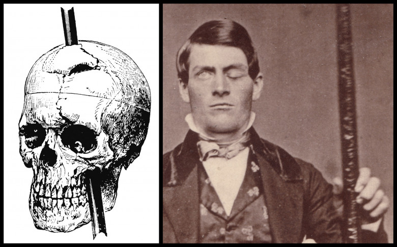 Рис. 3. Череп и фотография Финеаса Гейджа с железным ломом, нанесшим травму