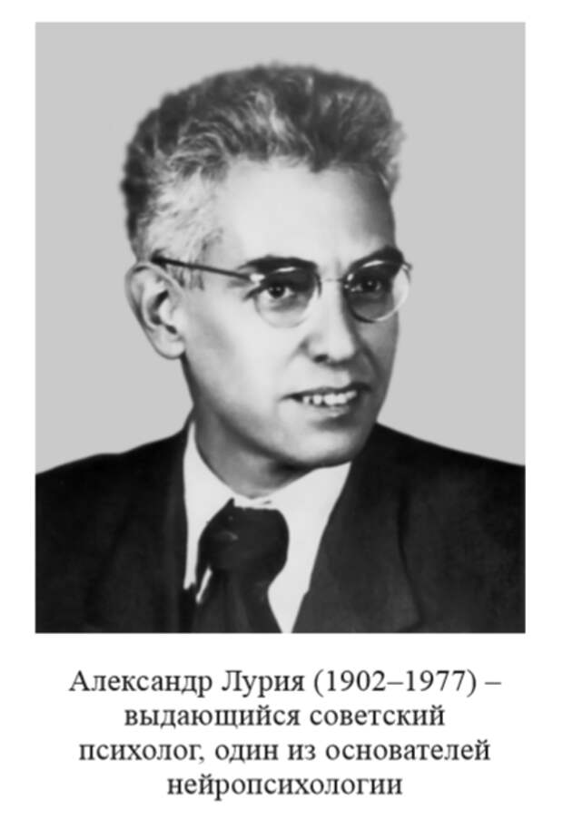 А.Р. Лурия родился в 1902 г. в Казани в семье врачей. Он учился на медицинском факультете Казанского университета, где заинтересовался психологией и неврологией. В 1924 году переехал в Ленинград, где начал работать на кафедре нервных болезней Ленинградского института психоневрологии. В 20-х гг., как соратник Л.С. Выготского, он участвовал в создании отечественной психологической науки, в разработке теории культурно-исторического развития психических процессов. В 1930-х годах Лурия начал изучать афазию – состояние, при котором человек теряет способность правильно использовать речь. Он разработал методы лечения этого заболевания и показал значение речи в организации психических функций у детей.