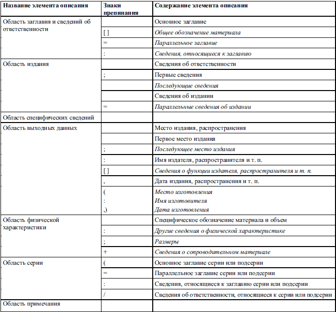 Одноуровневое библиографическое описание состоит из перечисленных в табл. 1.1 областей, представленных в такой же последовательности, с использованием указанных в таблице знаков препинания. Факультативные элементы выделены курсивом.