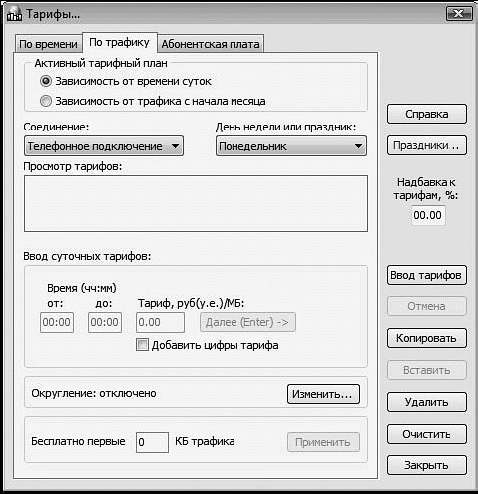 Для пользователей, считающих свои затраты, VDialer предлагает очень удобную систему статистики проведенного в Сети времени и потраченных денег. Просмотреть эти данные можно на вкладке Статистика. На вкладке Настройки, используя кнопку Настройки соединений, можно установить тарифы оплаты для разных соединений. Данная возможность особенно удобна, если пользоваться услугами нескольких провайдеров, которые взимают разную плату в зависимости от времени доступа, а иногда и дней недели, например, предоставляя скидки в выходные.