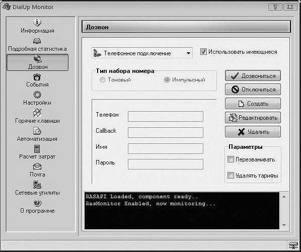 В разделе Статистика можно просмотреть детальную статистику по трафику и увидеть график загруженности интернет-канала. Детальную информацию по месяцам можно просмотреть в разделе Подробная статистика. Программа способна автоматически дозваниваться до провайдера по всем указанным соединениям; при этом в окне ее настроек можно задать все необходимые параметры: номер телефона, логин, пароль и необходимость повторного дозвона при наличии обратного звонка. DialUp Monitor позволяет использовать имеющиеся в системе номера дозвона, а также добавлять и настраивать новые непосредственно в окне программы (рис. 1.7).