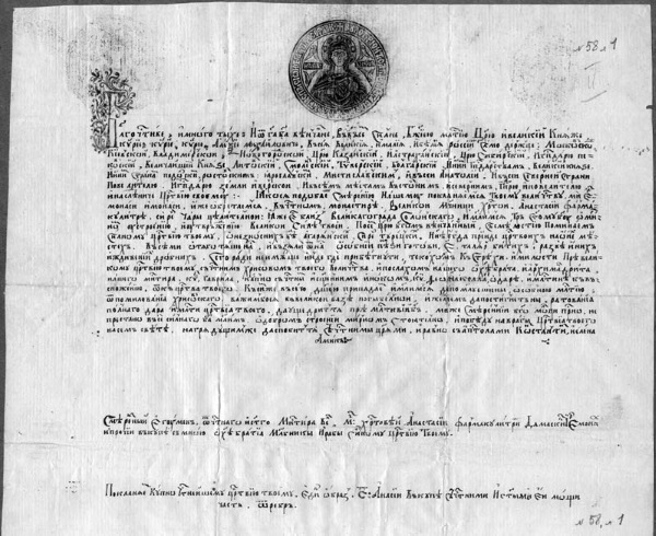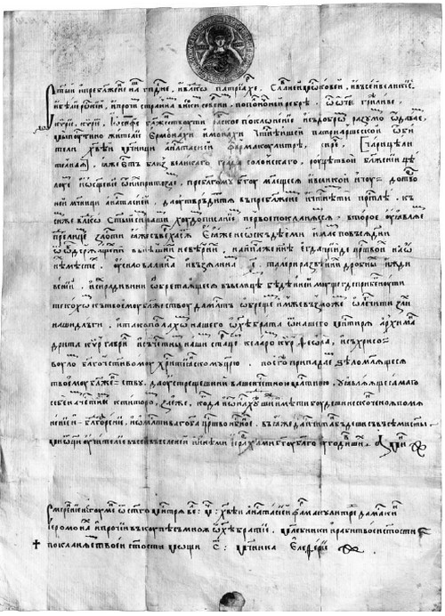 Рис. 1. Грамота из солунского монастыря Анастасии Узорешительницы московскому патриарху Иоасафу. ГИМ. Синод, грам. № 1030.