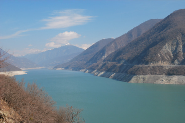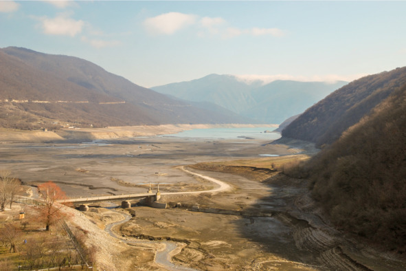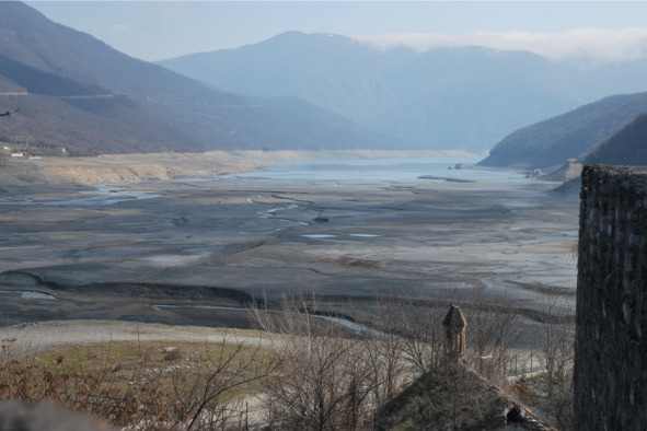 Приятными мелочами Зураб баловал нас всю дорогу вплоть до самого Казбеги. Как и солнышко, неожиданно выглянувшее из-за плотной завесы серых облаков на подступах к водохранилищу Жинвали, птичьей лапкой раскинувшему свои русла среди бескрайних, спящих под снегом, гор. Накануне весны воды много лишь у запруды, что возле ГЭС, но чем дальше отъезжаешь, тем ее уровень ниже, а песчаные берега шире.