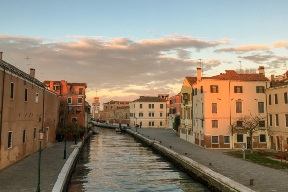 Начинаем с района Каннареджо (Cannaregio), где на задворках храма Santa Maria di Nazaret XVII века, он же церковь Босоногих (Chiesa degli Scalzi) и резиденция ордена босоногих кармелитов, в шаговой доступности от ж/д вокзала и видом из окна на колокола, будившие нас по утрам мелодичным звоном, находился наш отель Abbazia. Место довольно тихое, хотя до оживленной улочки Rio Terà Lista di Spagna и моста Босоногих (Ponte degli Scalzi), обязанного своим появлением вышеназванной обители, метров сто от силы.