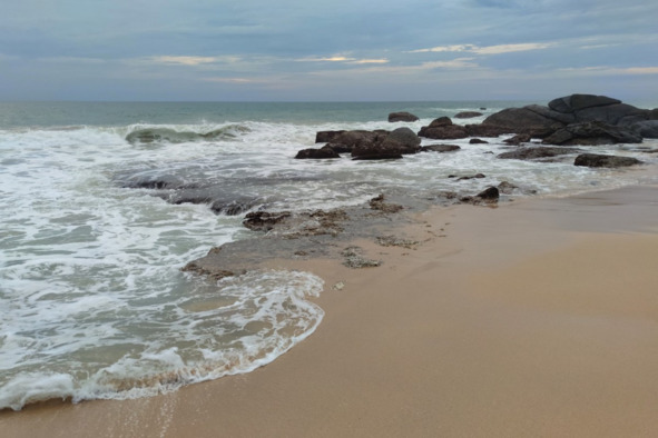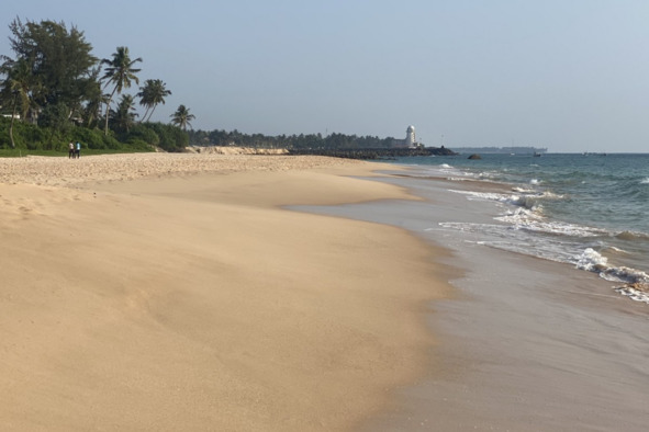 А вот сам пляж находится от упомянутой выше развилки чуть правее, нужно только обогнуть стоящий в конце 2nd Cross Road застекленный павильон с сидящим Буддой и глухие беленые стены территории… крематория, практически соседствующего с Sena Home, нашим несостоявшимся отелем. От скорбного места его отделяют лишь остовы старых баркасов да проложенная тропка, выводящая к полоске песка метров в триста, одновременно являющейся и зоной отдыха, и площадкой для спортивных занятий учеников соседней школы.