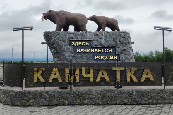 Аэропорт в Елизово встретил нас легкой моросью и сумрачным небом, затянутым тяжелыми свинцовыми тучами. Перед самым нашим прилетом в Петропавловске прошел сильный дождь и теперь налетающие порывы холодного ветра подхватывали срывающиеся с веток прозрачные капли, рисуя ими разбегающиеся в лужах круги и выбивая по крышам автомобилей незатейливый мотивчик. Капель, сбившись с такта, то фальшивила и затихала, то, взяв ноту повыше, нарастала с новой силой, пугая своим непостоянством прохожих, то разлеталась во все стороны мокрыми брызгами, норовя ткнуться в лицо и пробраться за шиворот. Только оказавшись в маленьком, но уютном салоне Аниной машинки, мы наконец-то смогли укрыться от непогоды и перевести дух. Впереди нас ждал короткий переезд в Петропавловск, заброска вещей в апартаменты и совместная с Анной прогулка по городу, знакомство с которым началось с жанровой скульптуры медведицы с медвежонком и надписями «Камчатка» и «Здесь начинается Россия».