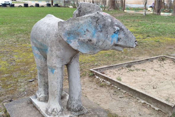 Что-то похожее есть и на другом конце города, на пяточке за домом №40 по улице Труда, но там уже африканские мотивы: страус, слоны и верблюд. А вот возле здания почты (Комсомольский пр., 29), расположенного, как утверждают некоторые источники, примерно на середине пути между Москвой и Санкт-Петербургом, можно увидеть оригинальный памятник бордюру и поребрику, ставший своеобразным консенсусом извечного лингвистического спора между двумя столицами о том, как правильно следует называть этот тротуарный камень.