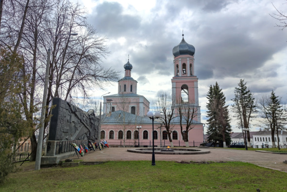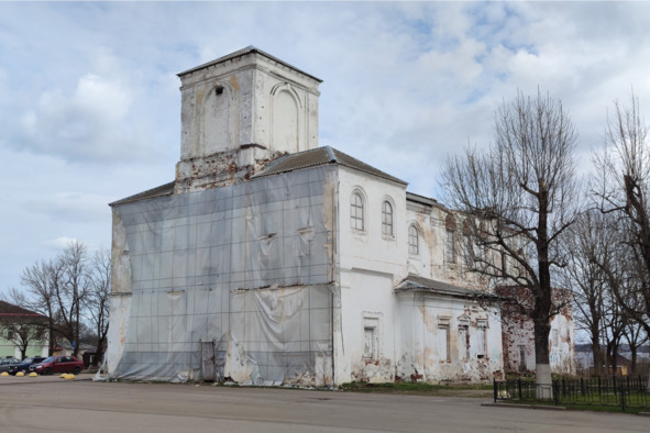 Рядом, слева, Вечный огонь, а за ним еще один храм. Это двухэтажная церковь Введения во храм Пресвятой Богородицы, возведенная в 1762 году, но неоднократно горевшая в XIX веке, вследствие чего верхний этаж с колокольней был уничтожен, но возобновить его так и не решились: то ли денег не было, то ли руки не дошли, а там и революция подоспела с ее катаклизмами. В наши дни строительной пленкой лишь лицевой фасад убран, все остальное на глазах ветшает, хотя лет десять назад, судя по старым фотографиям, вид храма был значительно лучше. Аналогичная ситуация с расположенными подле, через площадь, купеческими (торговыми) рядами: краснокирпичные остовы с выгоревшей сердцевиной и убогая видимость реставрации за счет натянутых полотен, имитирующих декор стен.