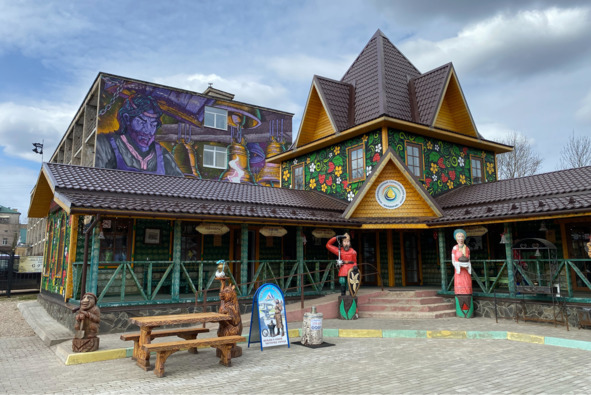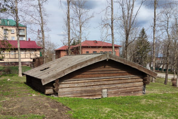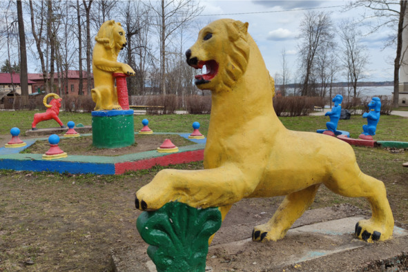 Там же, через дорогу, скромная придорожная часовня Иакова Боровичского XIX века, а в парке, на подступах к церкви Екатерины, небольшой добротный сруб, напоминающий «вкопанную» по маковку избу: то ли имитация землянки, то ли какое-то хранилище, но нет ни таблички, ни подсказок. Да и сами местные жители не знают, лишь руками разводят. Зато рядом детская площадка имеется, напоминает арену цирка: оседланная лошадка с заплетенным косой хвостом, горный козел с дугообразными рогами, замершие на задних лапках пуделя и грозные львы.