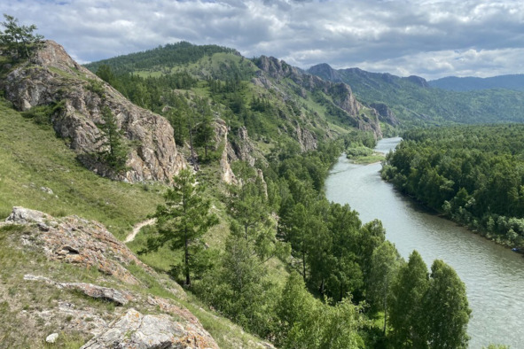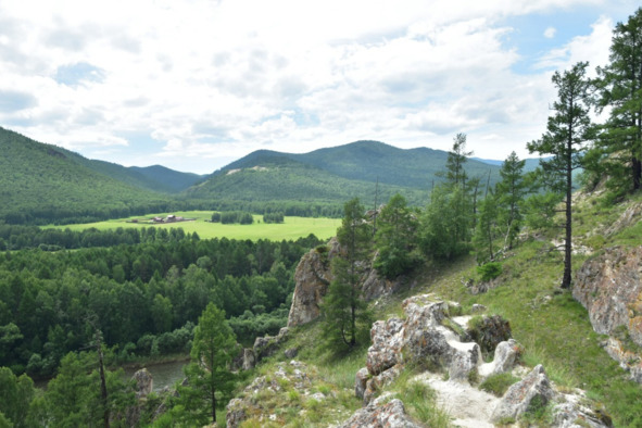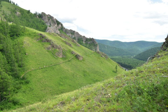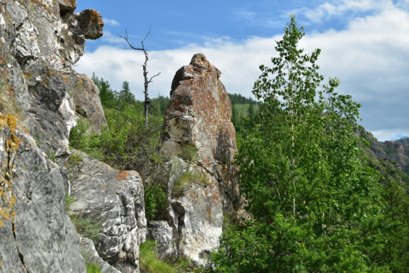 Рядом, в шаговой доступности, на левом склоне вклинившегося перпендикулярно руслу реки короткого распадка замерла часовым почетного караула старая, но все еще крепкая и стройная лиственница. Говорят, что ее возраст давно перевалил за 200 лет. Такие деревья в Хакасии считаются священными и их почтительно величают «пай-тыт», что дословно переводится как «богатая лиственница»49. Маршрут в этом месте раздваивается: одна тропа уходит вглубь хребта, взбираясь на гору, а другая вначале плавно скатывается в низину, а затем, идя как бы в обратном направлении, начинает карабкаться по противоположному склону, продираясь сквозь лиственничный молодняк и густую кустарниковую поросль, пока не вырывается с боем на оперативный простор, обдуваемый со всех сторон ветром. Этот участок пути не для слабонервных, он полон как реальных опасностей, так и незабываемых впечатлений. Да и название у него соответствующее – «Тропа Шамана».
