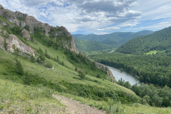 А первым серьезным экзаменом станет преодоление участка осыпи, идущего в обход скалистого утеса, на одном из отвесных склонов которого, обращенного лицом к тропе, имеется сквозная пещера или так называемый Туннель Ухо. Не имея альпинистской подготовки, а также уверенности в собственных силах, в этот проход самостоятельно, без подстраховки, лучше не соваться. Мне повезло, мои действия контролировали ребята, Евгений и Владимир, вовремя подсказывая, куда поставить ногу и за что ухватиться рукой (Надежда с нами не ходила, осталась еще в самом начале Тропы Шамана), а вот идущей впереди нас группе туристов пришлось сделать большой крюк, вначале спускаясь по скользящему и осыпающемуся под ногами каменистому крошеву в сторону реки, а это несколько десятков метров, а потом таким же способом поднимаясь наверх.