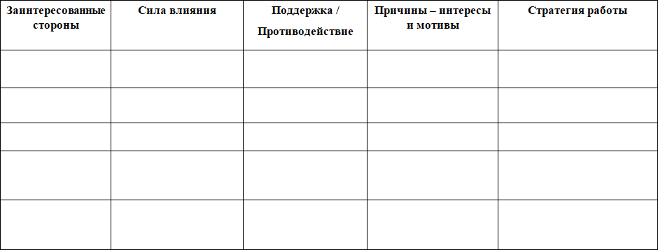 4. Отметить интересы сторон и отношение к проекту по шкале от -5 до +5;