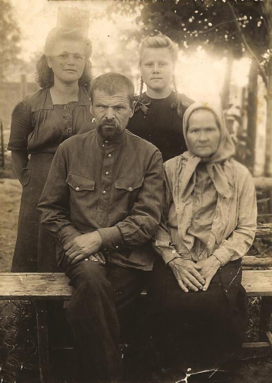 По рассказам мамы, дедушка Алексей был очень мягким и добрым, они с сестрой звали его тятей и вили из него веревки. Уж очень любил тятя своих девочек, часто баловал сладкими пряниками и защищал от нападок строгой мамы. Скрывая проказы своей любимицы, моей мамы, часто попадал под горячую руку жены, она брала ухват и гоняла его по всему дому. Дедушка Алексей не воевал на фронте, его списали за негодностью. У него был ревматизм, осложнившийся болезнью суставов и сердца. Несмотря ни на что, он вместе со всеми рыл окопы и работал в колхозе за троих мужиков. В 1949 году у него отказали ноги, и его положили в Ивановскую больницу, там он и умер. Очень тяжело бабушка пережила его уход. Любила его сильно, очень жалела, несмотря на показную строгость. «В селах Рязанщины, в селах Смоленщины слово «люблю» непривычно для женщины, там, бесконечно и верно любя, женщина скажет: «Жалею тебя»…» Для нее не существовало других мужчин. Замуж больше не выходила, а может, не захотела, в памяти мужа храня. Даже после смерти своих мужей женщины хранили им верность.