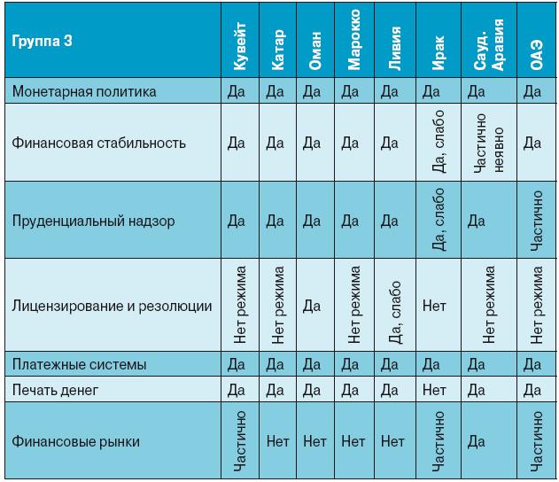 Третья группа стран с экономиками исламского типа включила в себя ОАЭ, ОМАН, Ирак, Кувейт, Катар, Марокко и Саудовскую Аравию (Таблица 3). Все регуляторы данной группы стран ответственны за развитие платежных систем, выпуск наличных денег и денежно-кредитную политику. Финансовая стабильность и пруденциальный надзор в основном в этих странах носит инструкционный характер, обязательный к выполнению, как и в России. В ОАЭ центральный банк ответственен за надзор, но не в Дубае и не в Абу-Даби. Революционный режим поддержки банков в случае временных финансовых трудностей, так называемая экстренная поддержка ликвидностью ELA (Emergency Liquidity Assistance), а также санирование банков, отсутствует во всех странах, кроме Омана и Саудовской Аравии.