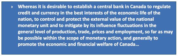 Перевод данного текста таков: «Банк Канады учрежден для регулирования кредитных и валютных отношений в интересах экономической жизни нации, для контроля и защиты обменного курса национальной денежной единицы и для сдерживания влияния его колебаний на общий уровень производства, торговли, цен и занятости настолько, насколько это возможно в рамках монетарной деятельности, и для общего продвижения экономического и финансового благополучия Канады…»