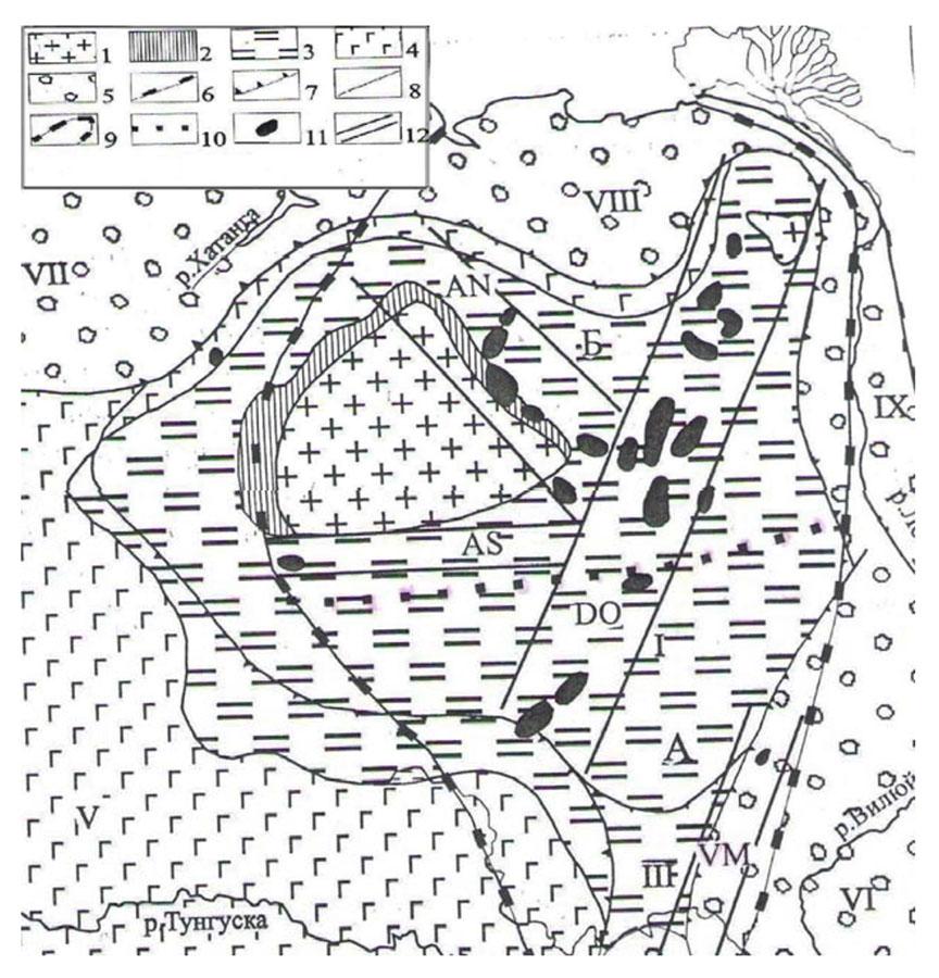 Рис. 1. Схема геолого-тектонической структуры территории ЯАП. 1- Архей-палеопротерозой; 2 – мезо – и неопротерозой; 3 – палеозой; 4 – интрузивные траппы с возрастом 250 млн. лет; 5 – мезозой; 6 – граница Сибирской платформы; 7 – границы региональных тектонических структур: I-Анабарская антиклиза, III-Сюгджинская седловина, V-Тунгусская синеклиза, VI- Вилюйская синеклиза, VII-Енисейско-Хатангский прогиб, VIII-Лено-Анабарский прогиб, IX- Приверхоянский прогиб.; 8 – геологические границы; 9 – контур Якутской кимберлитовой провинции; 10 – граница между Вилюйской (А) и Анабаро-Оленекской (Б) субпровинциями; 11 – кимберлитовые поля; 12 – границы минерагенических зон: VM- Вилюйско-Мархинская, DO- Далдыно-Оленекская, AS- Арга-Салинская, AN- Анабарская (Смелов, Зайцев, 2010)