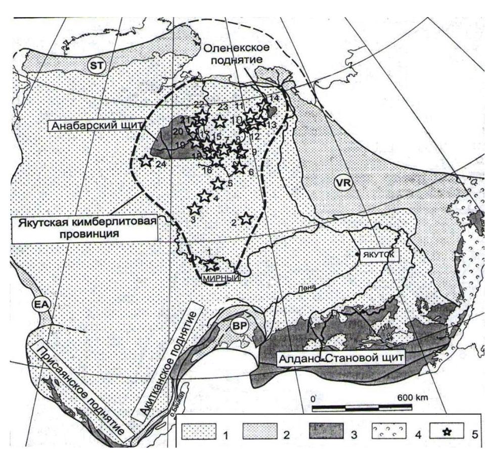 1- Сибирская платформа; 2- Складчато-надвиговые пояса и окраины кратона; 3- Выход докембрийского фундамента (щиты и поднятия); 4- Мезозойский вулкано-плутонический пояс; 5- Кимберлитовые поля (1-Мало-Ботуобинское; 2-Накынское; 3-Алакит-Мархинское; 4- Далдынское; 5-Верхне-Мунское; 6-Чомурдахское; 7-Западно-Укукитское; 8-Восточно-Укукитское; 9- Огонер-Юряхское; 10-Мерчимдинское; 11-Куойкское; 12- Моркокинское; 13-Толуопское; 14-Хорбусуонское; 15-Лучаканское; 16-Куранахское; 17- Дюкенское; 18-Биригиндинское, 19-Ары-Мастахское; 20- Старореченское; 21-Орто-Ыаргинское; 22-Эбеляхское; 23 Томторское; 24-Харамайское).
