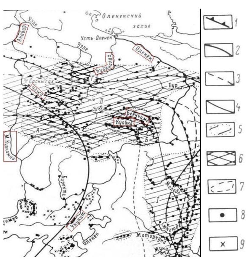 1-граница Анабарской антеклизы; 2-береговая линия нижнеюрского моря; 3-береговая линия среднеюрского моря; 4- береговая линия верхнеюрского моря; 5- россыпи, не имеющие видимой связи с определенными коренными источниками; 6- площади групп россыпей: А-эбеляхская, Б- беенчиме-куойкинская, В- верхнеуджинская, Г- уджа-уэлинская; 7- россыпи, расположенные в пределах поля развития кимберлитовых трубок; 8- места находок алмазов в аллювиальных отложениях; 9- кимберлитовые трубки;