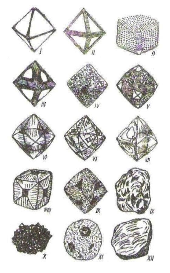 Эта классификация охватывает все морфологическое разнообразие алмазов. В каждой отдельной группе выделено несколько переходных типов.