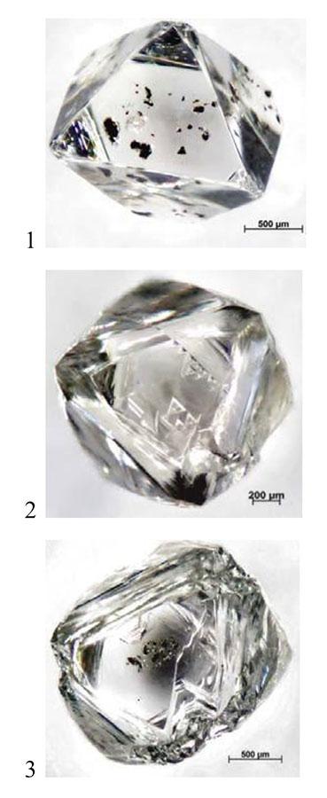 Рис. 5. Кристаллы алмаза разновидности I с различным характером развития граней (тр. Малая- Куонамская (1-2) и россыпь реки Биллях (3)).