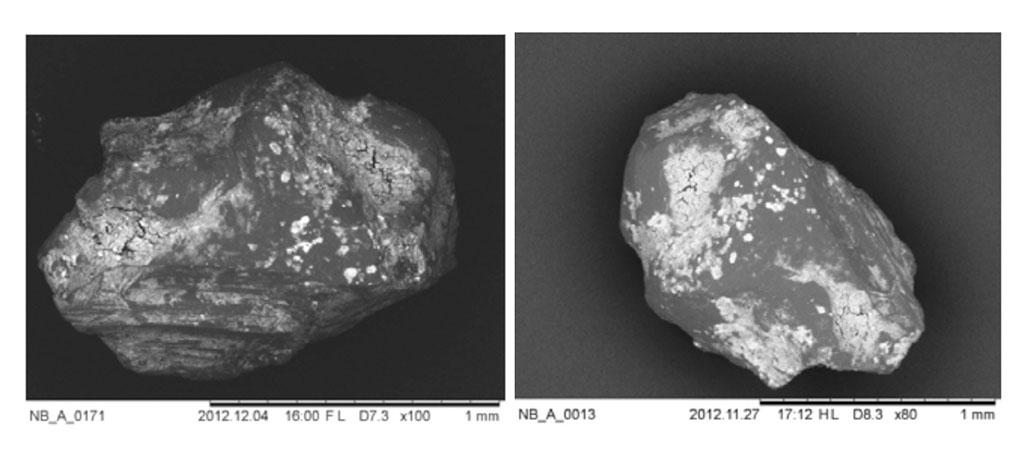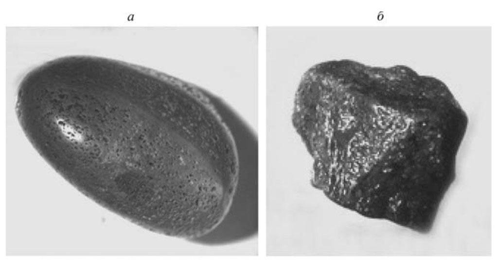 Рис. 14. Поликристаллические сростки субмикроскопических зерен алмаза, разновидность X, Карбонадо из Бразилии (В.П. Афанасьева, 2011), а – сильно окатанное карбонадо; б – слабо окатанное