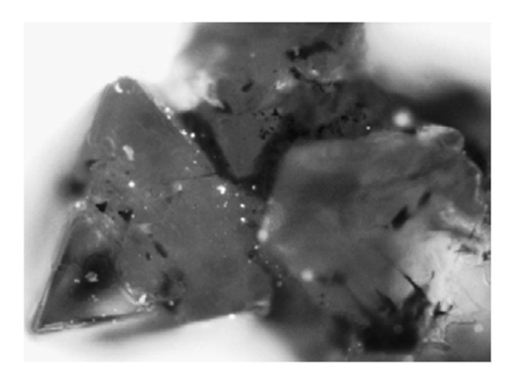 Рис. 9. Кристалл алмаза разновидности V (типичный кристалл пятой разновидности с прозрачными бесцветными вершинами (конуса растворения, на которых уничтожена внешняя зона с черными включениями графита) Анабарская область, река Дьэлиндэ.
